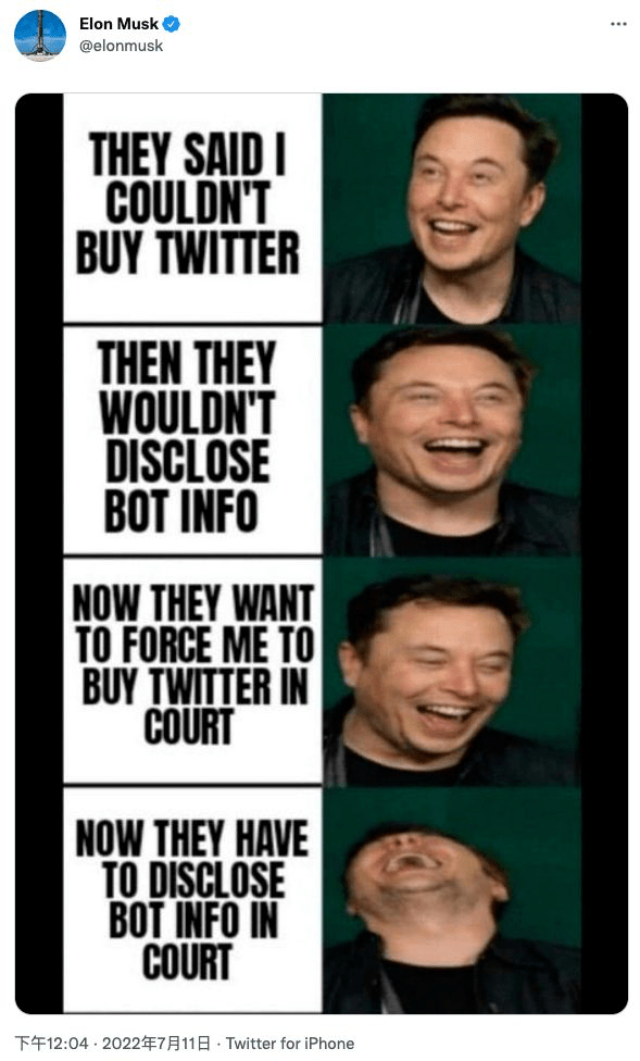对于推特的起诉,马斯克本人也在当地时间周日深夜对进行了回应:马斯克在推特上发布了一个表情包,右边是他自己大笑的照片,左边则配上文字,回顾了过去几个月推特对这笔交易的态度:“他们(先是)说,我不能收购推特。接着,他们又不肯披露虚假账户信息。现在,他们想在法庭上强迫我收购推特。现在,他们不得不在法庭上披露虚假账户信息。”
