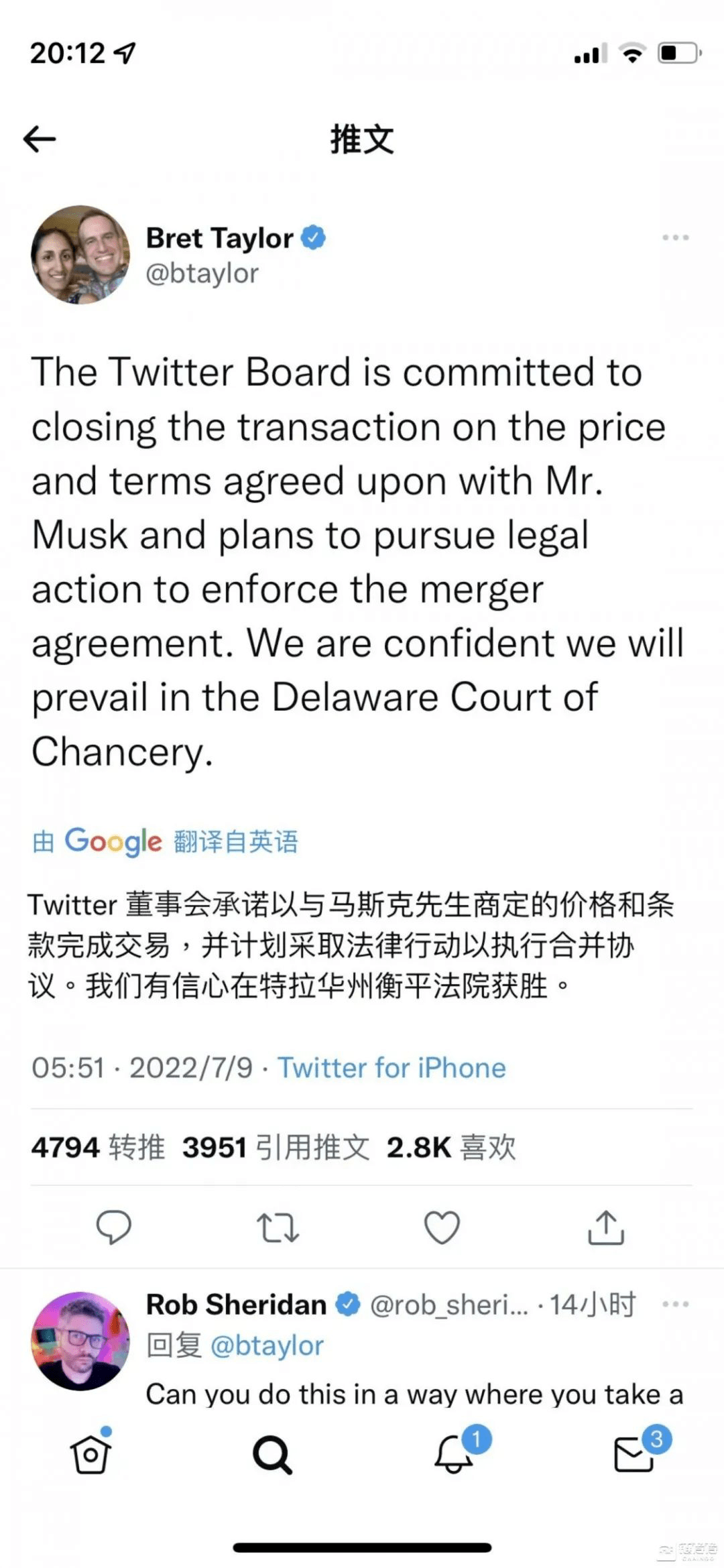 而推特自然不会无动于衷,面对马斯克的指控,7月8日当天推特公司董事长泰勒(Bret Taylor)发布推文称:“推特董事会致力于按照和马斯克先生达成的价格和条款来执行合并协议,我们有信心可以在特拉华州法院取得胜利。”