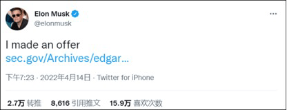 今年4月14日,马斯克高调亮出了自己要收购推特的计划,在其当天发布的一篇推文中附带了推特公司提交给美国证券交易委员会(SEC)的文件,显示马斯克当天向推特提交了一份私有化提案,计划以每股54.2美元、总价约440亿美元的现金出价购买推特100%股份。
