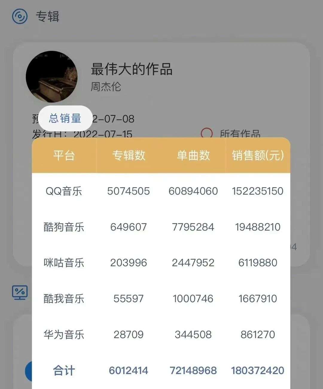 虽然褒贬者各有理由,但流量却在割裂的讨论中以惊人的速度增长。发布不到一天,新专辑全网总销量破500万张,截至7月18日14时,全网销售销量突破600万张,销售总额突破1.8亿。 这是华语音乐史上首张销售额破亿的数字专辑,周杰伦也成功反超泰勒·斯威夫特,成为全球歌坛单张专辑销量第一人。