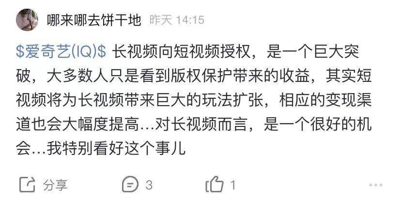 有爱奇艺投资人在雪球信心满满地表示:短视频将为长视频带来巨大的扩张玩法,相应的变现渠道也会大幅提高。受与抖音合作这一利好消息的刺激,爱奇艺美股股价当天上涨近10%。