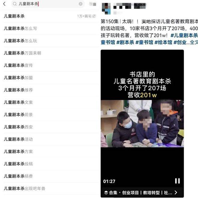 图/小红书平台儿童剧本杀相关贴子(左) 抖音平台儿童剧本杀宣传视频(右)