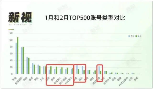 而2022年1-2月,视频号TOP500榜单中,美食、音乐等易于搬运的泛娱乐内容占比,平均减少50%;相反,运动、教育、母婴育儿等泛知识类账号占比明显增加。