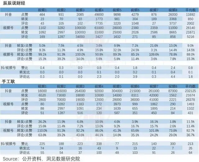 样本统计显示,泛知识类账号辰辰说财经,同样的内容,在视频号的点赞、评论量,远高于抖音;泛娱乐账号手工耿,同样的内容,抖音的点赞、评论要远超在视频号,但转发/点赞对比,视频号却高于抖音。