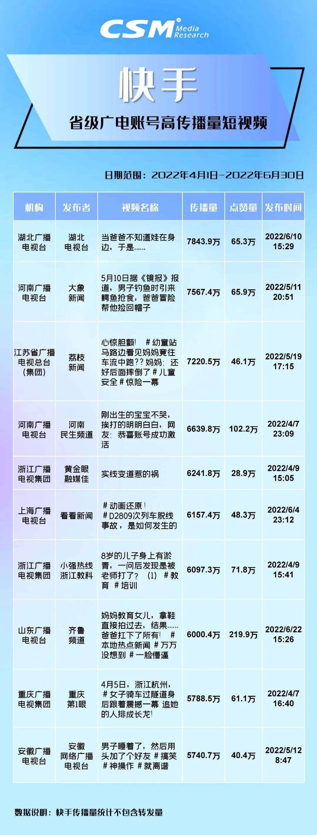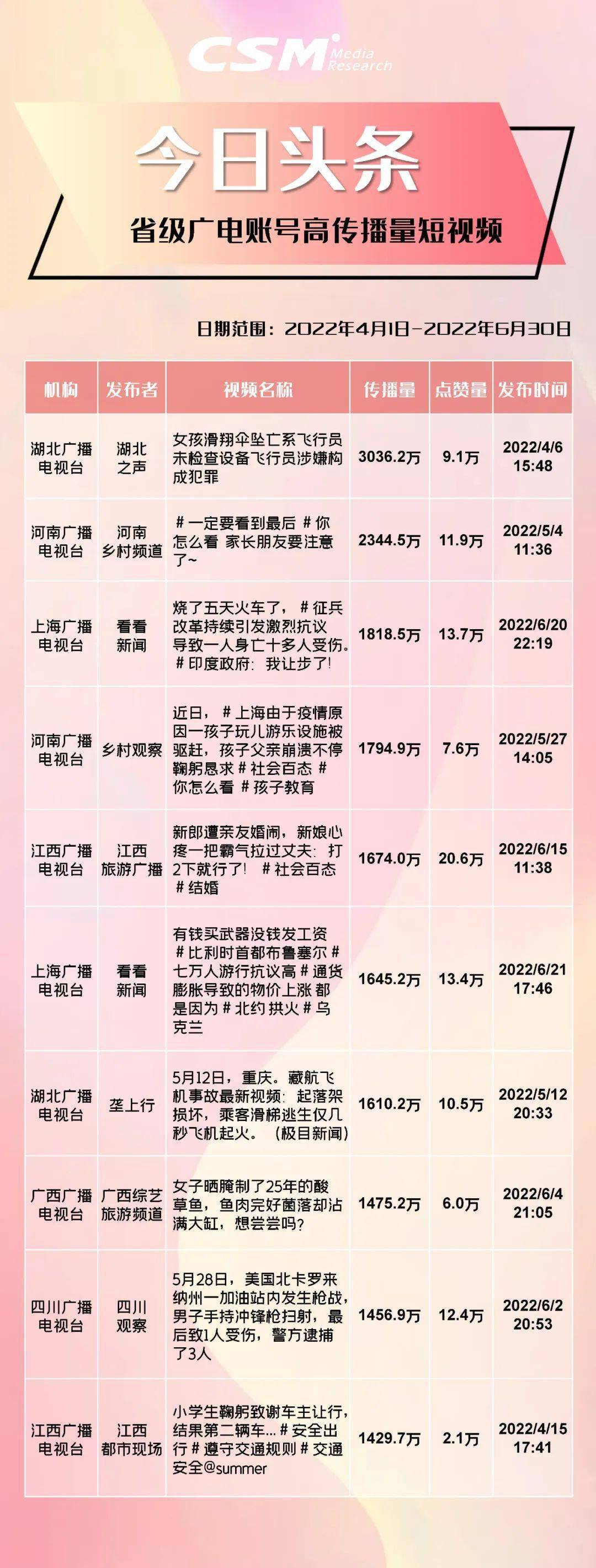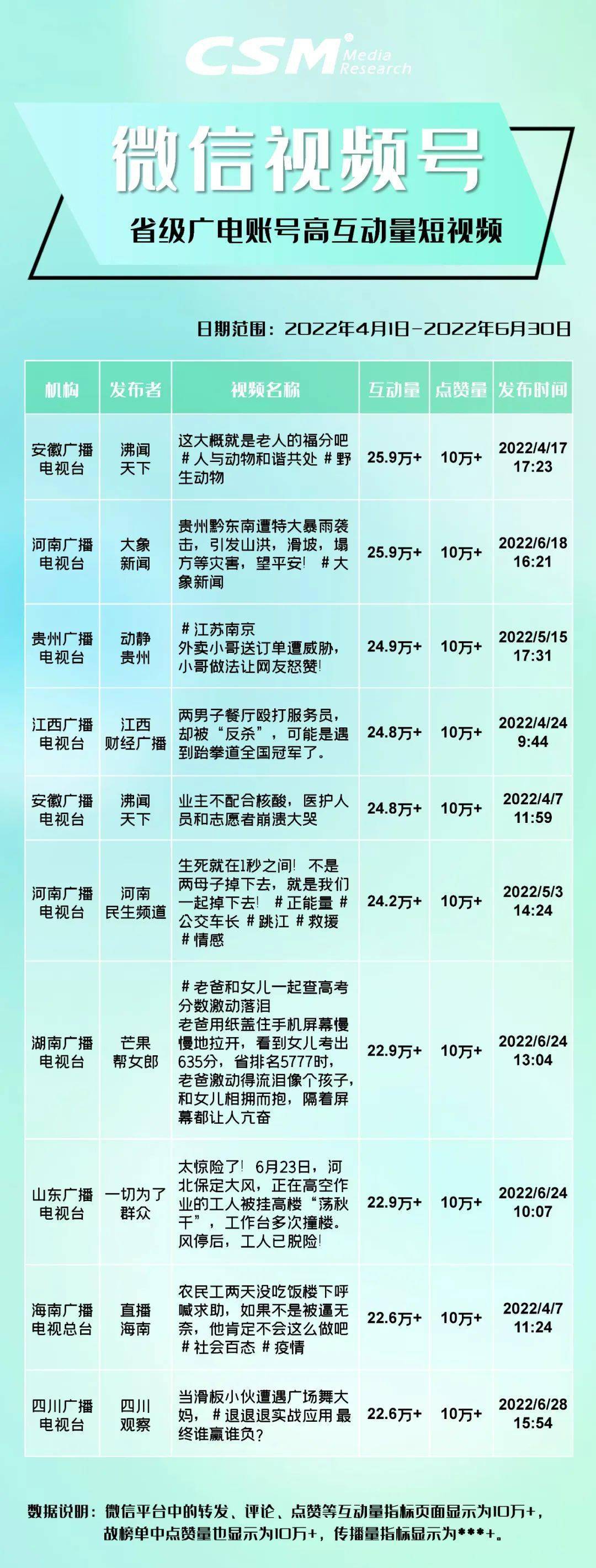CSM持续追踪广电媒体在新媒体平台传播表现,以下是根据CSM“V +Scope”融合媒体云平台数据,整理得出2022年第二季度在抖音、快手、今日头条、微信视频号四大平台获得高互动量和高传播量的广电短视频,与业界分享。