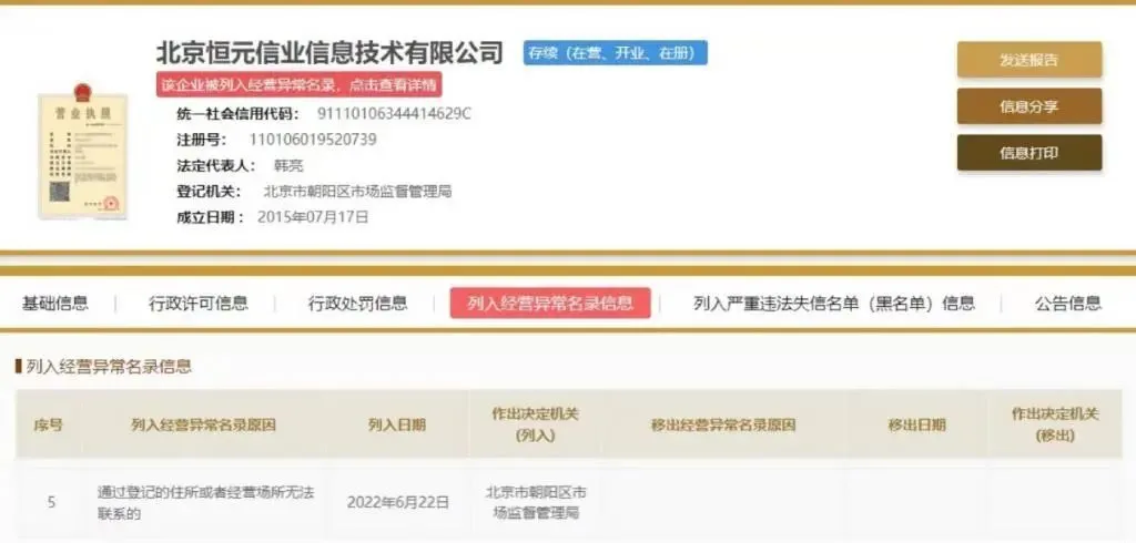 根据国家企业信用信息公示系统官网显示,北京恒元信业信息技术有限公司(下称 “恒元信业”)被北京市朝阳区市场监督管理局,列入经营异常名录。原因是“通过登记的住所或者经营场所无法联系的”。这也是恒元信业第5次因“失联”被列经营异常名录。