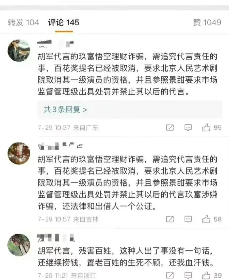 两年来,悟空理财的出借人不止一次跑到胡军的微博下向胡军求助,但这位玖富首席体验官胡军并没有第一时间站出来道歉发声,而是选择沉默逃避责任,在互联网删评论来掩盖舆论的风波。