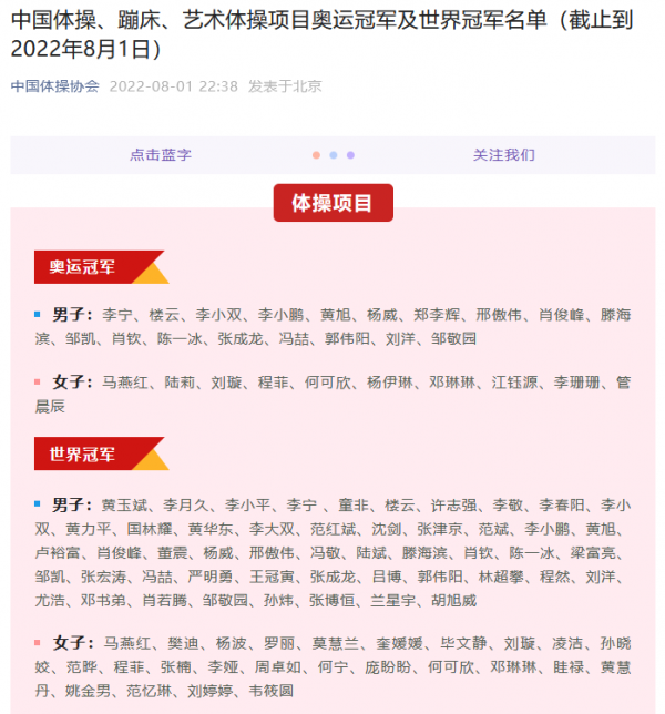 8月1日,中国体操协会官方微信公众号和官方微博同时发布《中国体操、蹦床、艺术体操项目奥运冠军及世界冠军名单》,标题中强调,这是截止到2022年8月1日的最新数据。