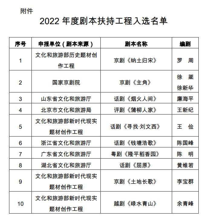 记者从文化和旅游部官网获悉,2022年度剧本扶持工程评审工作已于日前结束。文化和旅游部艺术司于17日公示了2022年度剧本扶持工程入选名单,京剧《纳土归宋》、京剧《主角》等10部剧本入选。公示时间为2022年11月17日至23日。