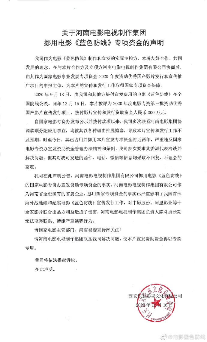 西安识君影视还在声明中表示,河南电影电视制作集团有限公司作为河南省全资国有的省属企业,挪用国家专项资金的事实已严重影响了我国首部海外战地维和纪实电影《蓝色防线》宣传发行工作,对中影股份、阿里影业等十余家影片联合出品方利益造成了侵害。并要求河南影视集团联系该公司解决问题,使电影宣发资助资金得以专款专用。