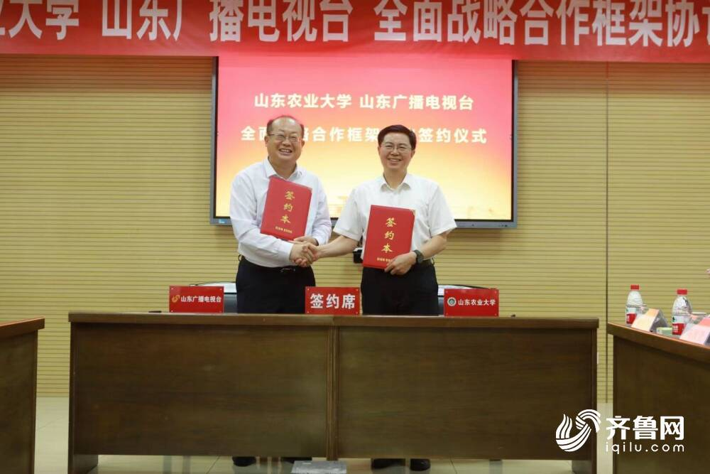 山东农业大学与山东广播电视台7月17日在泰安签署全面战略合作协议,双方将聚焦合作重点,大力推动校台在产教融合、宣传报道等领域开展全方位、深层次合作,实现双方专业资源与优势平台的融合共享,努力将双方合作模式打造成为省媒与高校深度融合、协同创新、共赢未来的新标杆。