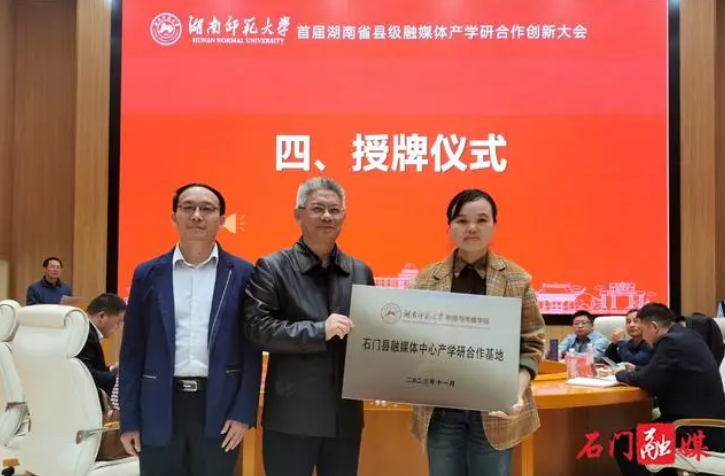 11月29日,首届湖南省县级融媒体产学研合作创新大会暨湖湘地方特色文化进校园活动在湖南师范大学举行。石门县融媒体中心受邀参加活动,作为首批21家县级融媒体中心之一与湖南师范大学签订产学研合作协议并获授牌。