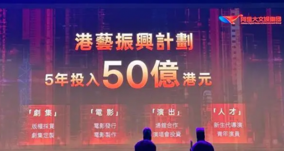 11日,在香港文体旅局、中央政府驻港联络办宣文部、国家广电总局港澳台办公室、国家电影局、上海市广电局的见证下,阿里大文娱发布“港艺振兴计划”。阿里大文娱宣布,未来5年将在香港剧集、电影、演出和青年人才培养四大领域投入不低于50亿港元。