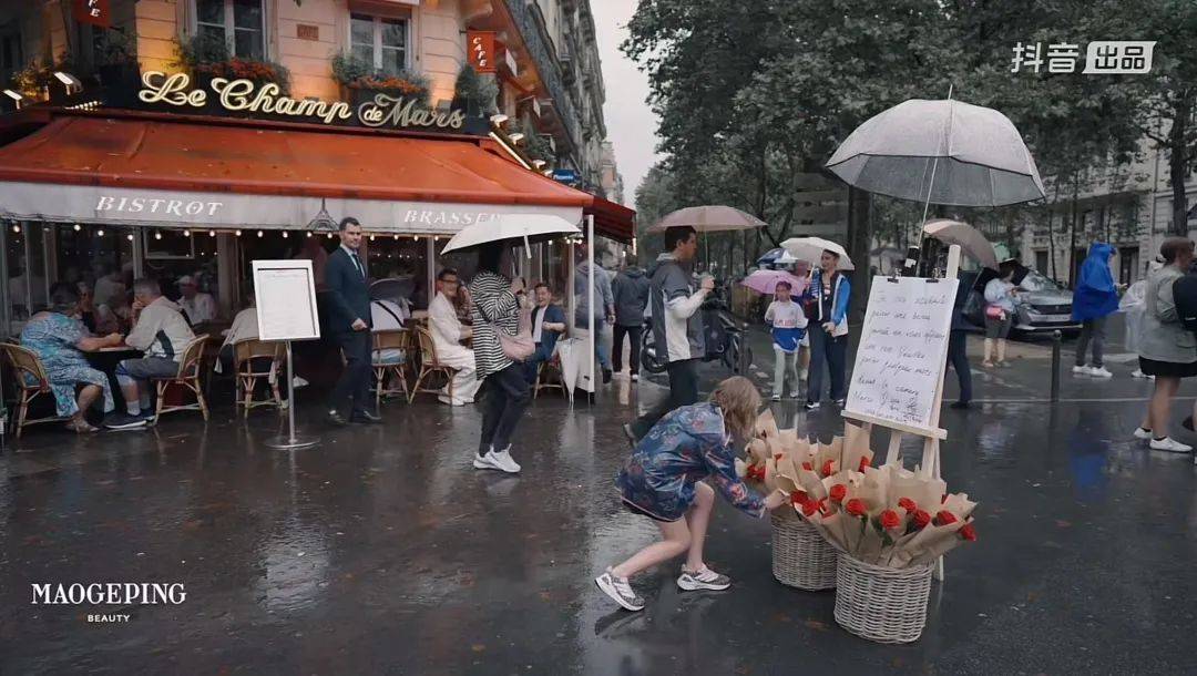 细雨中的巴黎街头,人们撑着伞匆匆走过,在这里也有着许多为工作生活而忙碌的人,直到一个小女孩从花堆中拾起一支免费玫瑰,掌声响起的瞬间这个城市的浪漫底色得以显现。