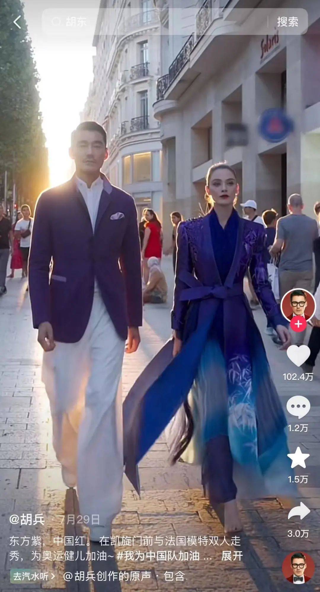 化着中式妆容的模特穿上中国设计师设计的服饰,与胡兵共同在巴黎上演一出街头走秀。中式审美的韵味与气场吸引海外路人纷纷驻足拍照,走秀视频在抖音上点赞量达100w+,网友也因西方模特与中式风格搭配得相得益彰而惊讶。