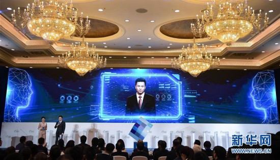 12月27日,AI合成主播与大会主持人一同出现在第六届中国新兴媒体产业融合发展大会上。 新华社记者 薛玉斌 摄
