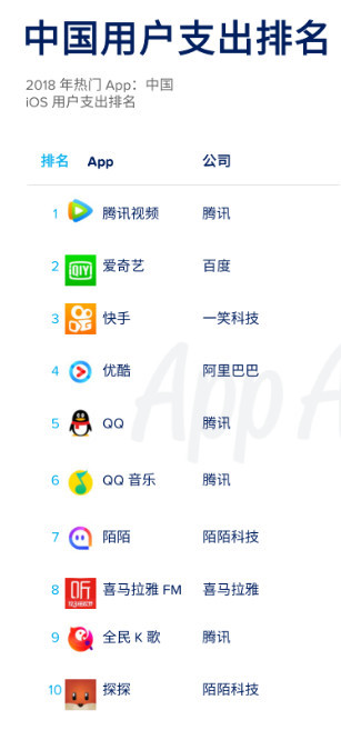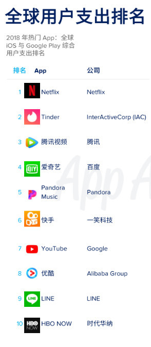 其中,在全球 iOS与 Google Play 综合用户支出榜单(非游戏)上,腾讯视频位列排行榜第三,仅次于Netflix和Tinder。