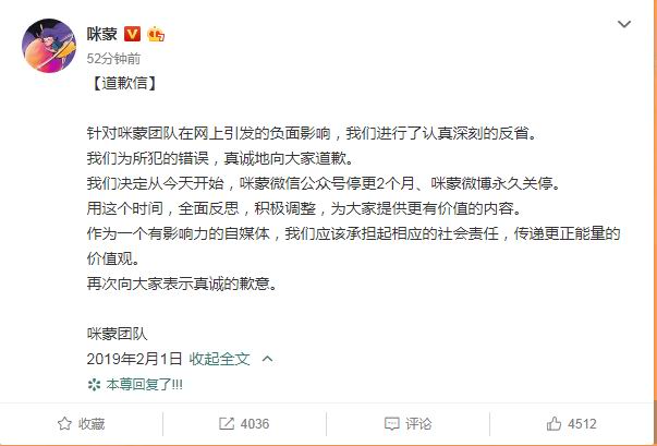 2月1日上午,咪蒙团队就刷屏文章在官微致歉,表示为所犯的错误,真诚地向大家道歉,此外,咪蒙微信公众号停更2个月、咪蒙微博永久关停。