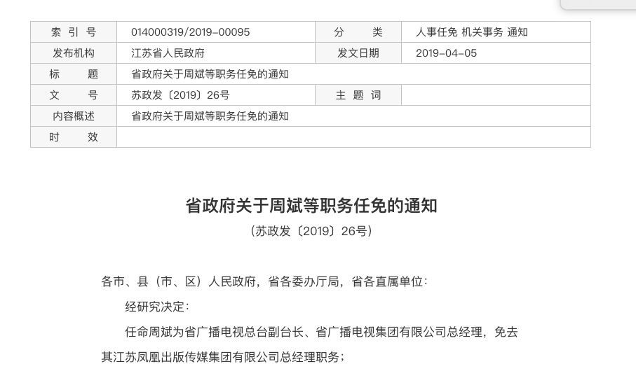 4月15日,江苏省政府官网的“政务公开”专栏发布人事任免通知。