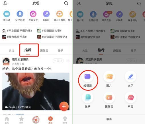 只是在近日,喜马拉雅开始将自己的视频模块提至台前。用户只需要点击发现,即可在推荐页面看到视频信息流。而点击一旁的加号,则会有包括短视频在内的分类按钮,以供用户进行发布选择。