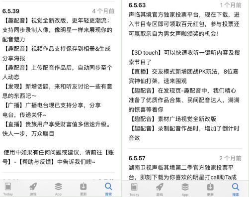 喜马拉雅对这一功能也格外重视。在App Store的版本更新记录中,这一功能多次被提及。尤其在一个月前的改版中,趣配音不仅被提到了发现页,素材广场视觉也被全新改版,并新增倒计时音效等。