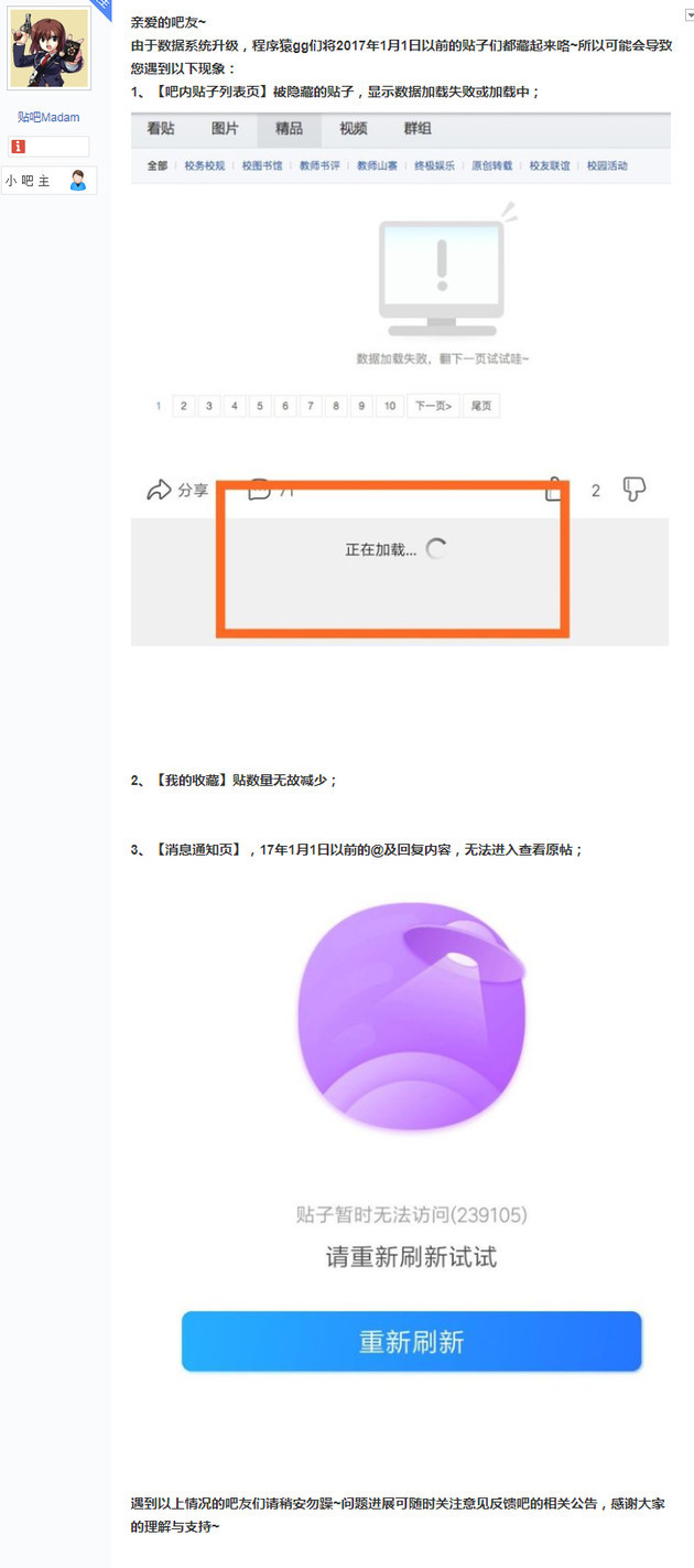 百度贴吧官方给出的公告显示,因系统维护历史数据,2017年1月1日以前的贴子暂时无法访问,修复时间另行通知。