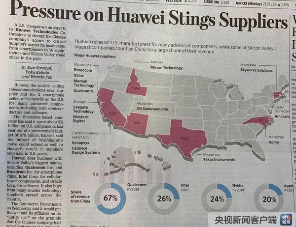 《华尔街日报》5月17日经济与金融版头版头条刊载文章,题为《施压华为,刺痛供应商》。