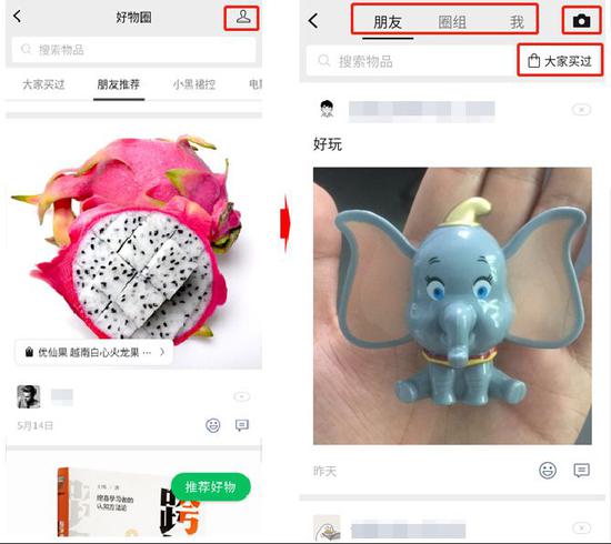 首先是界面大变样,它将原来新增的‘圈组’栏目移至顶部,与‘朋友’和‘我’栏目并列。原来右上角的‘我’则替换成相机icon,作为用户推荐好物的入口;至于最初的‘大家买过’功能,则改到搜索栏右侧,共同置于顶部导航栏之下。