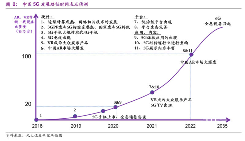 根据光大证券的研报,几大主流消费电子硬件将陆续迎来爆发期。2020年,5G手机出现并大规模量产。2021年,5G电视出现,VR也将在这一年成为大众娱乐产品。2022年,中国AR市场将会爆发。此外,5G爆款应用将在2020年出现,开启5G对传媒行业的重构,拥有海量用户、市场占有率高的5G时代统治级平台(智能手机OS之于4G时代)有望在2021年出现。2022年左右,5G娱乐内容达到繁荣期。
