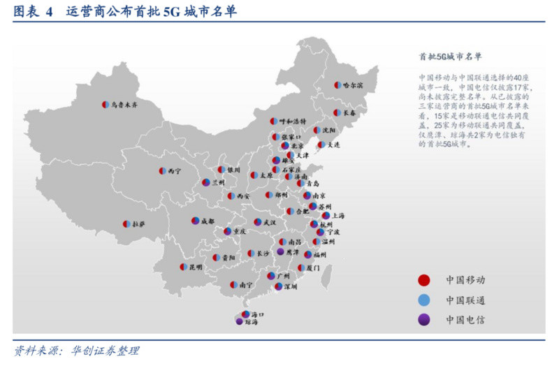 国内方面,中国移动、中国联通宣布年底前将在 40 座城市完成 5G 网络初步部署,中国电信目前公布的城市数为17座。