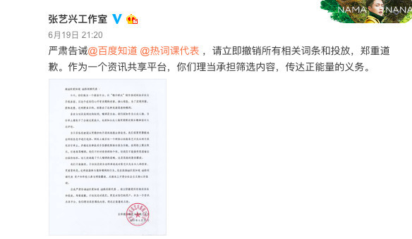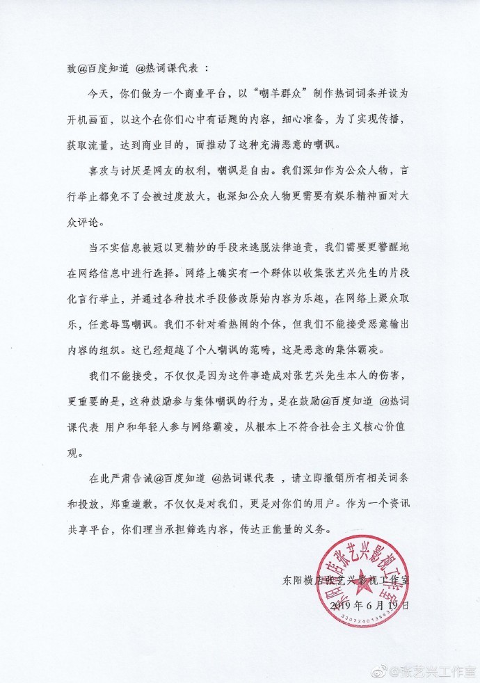 针对百度平台对“嘲羊群众”的所有相关词条和投放,6月19日晚上,@张艺兴工作室 发表声明要求百度平台立即撤销,并郑重道歉,并称这是恶意的集体霸凌。