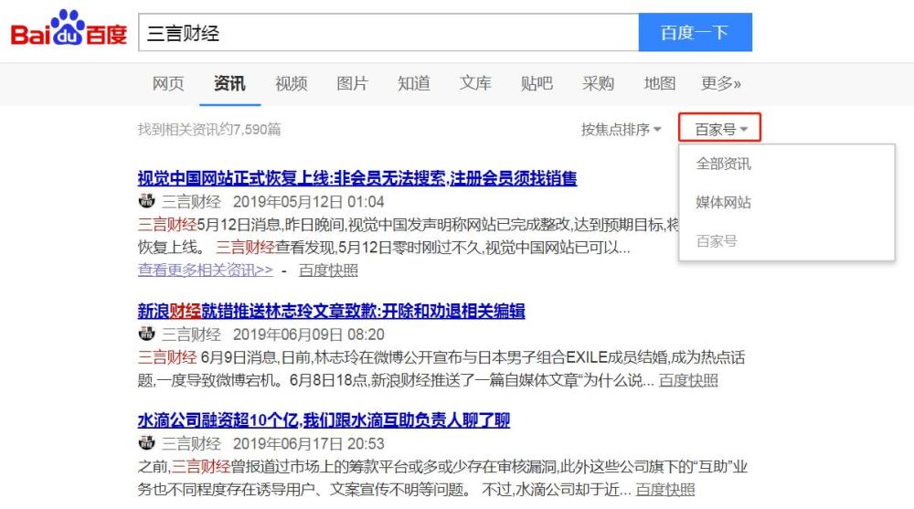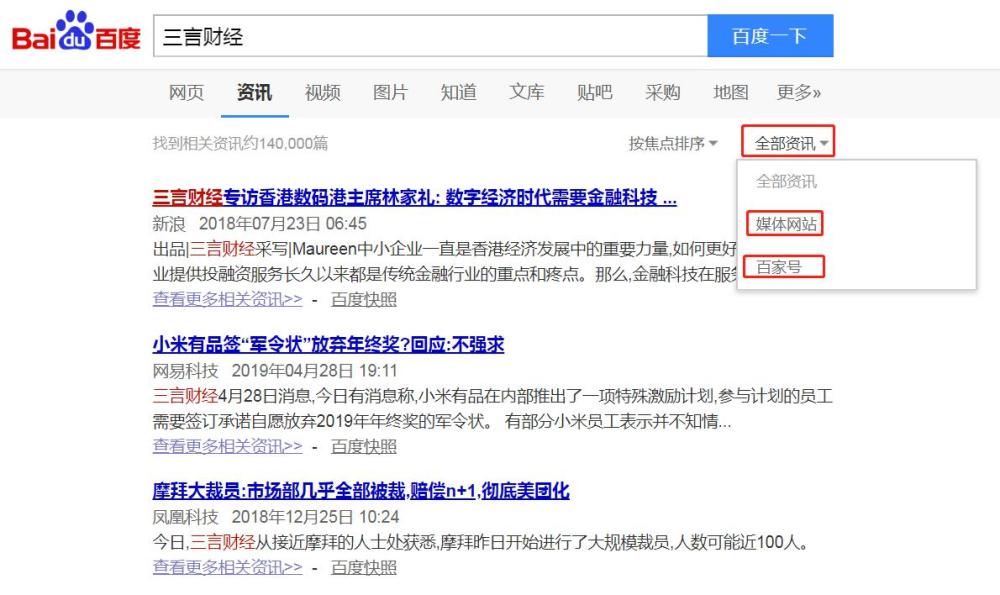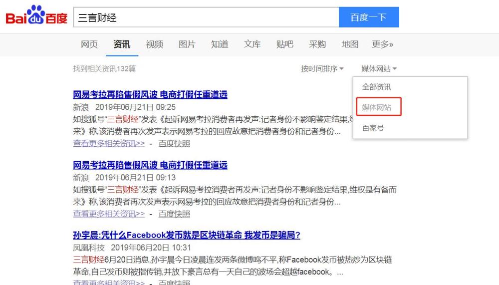 具体而言,在百度搜索关键词后,选择资讯一栏,然后在全部资讯旁的倒三角下拉菜单处,可点击选择搜索内容来源,区分“媒体网站”及“百家号”。