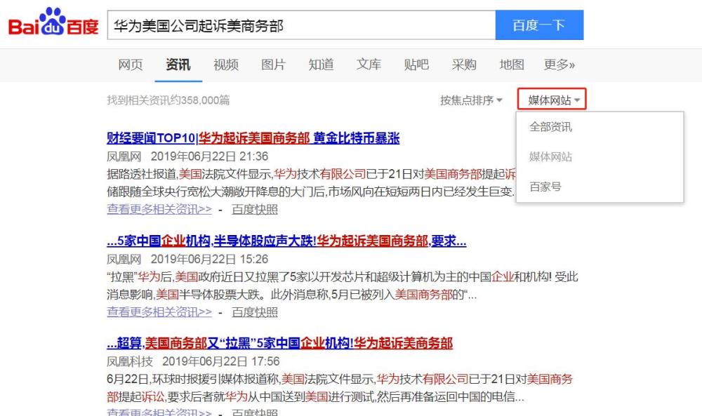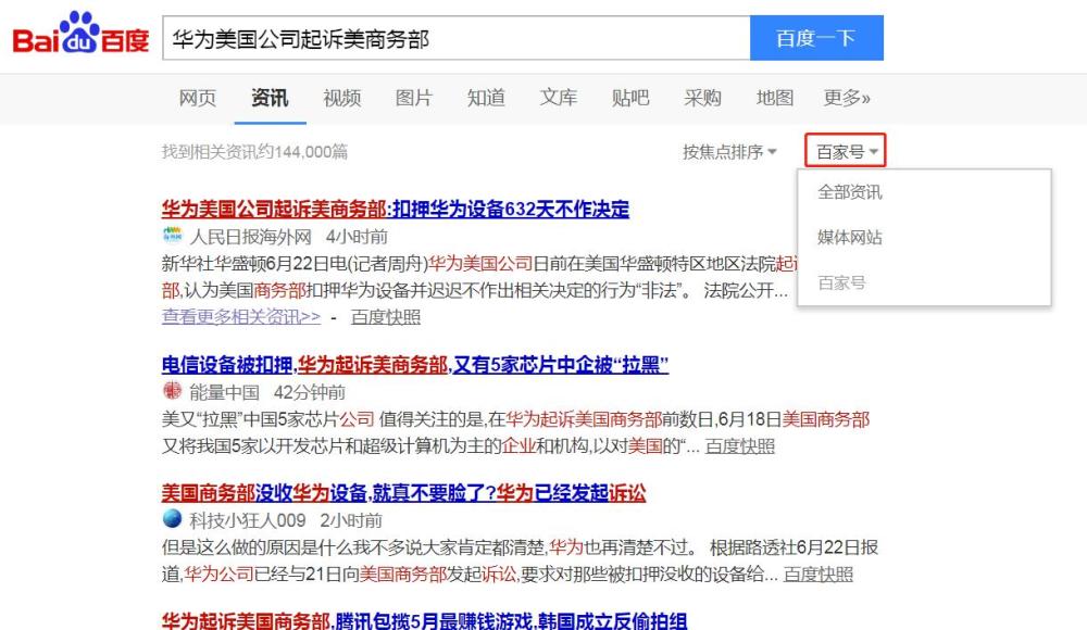 默认选项为全部资讯,即包括百家号和各大媒体网站。若选择媒体网站,则内容只来自媒体网站。若选择百家号,则相关资讯全部来源于百家号。