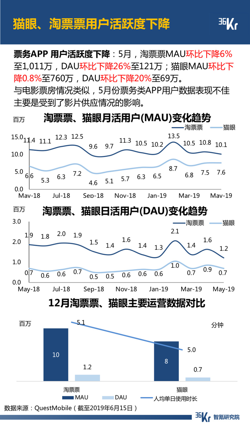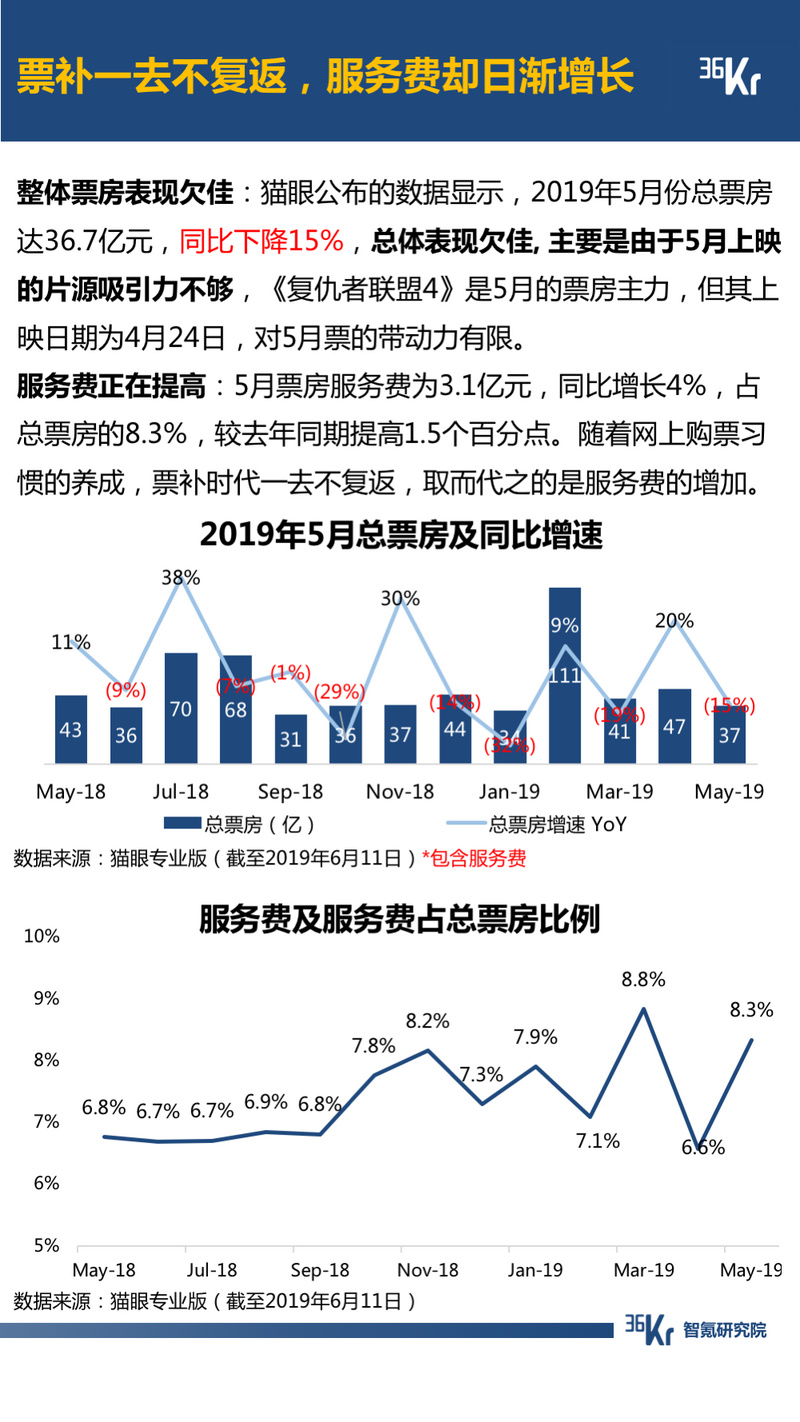 电影方面,5月电影票房总体表现欠佳, 主要是由于当月上映的片源吸引力不够,受此影响,票务类APP5月份的用户数据表现也不佳。值得注意的是,票补时代一去不复返,服务费却日益增加。
