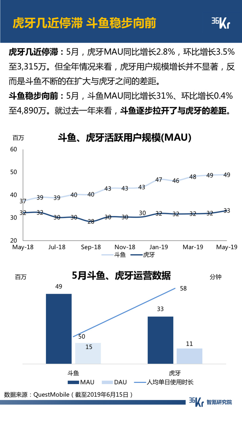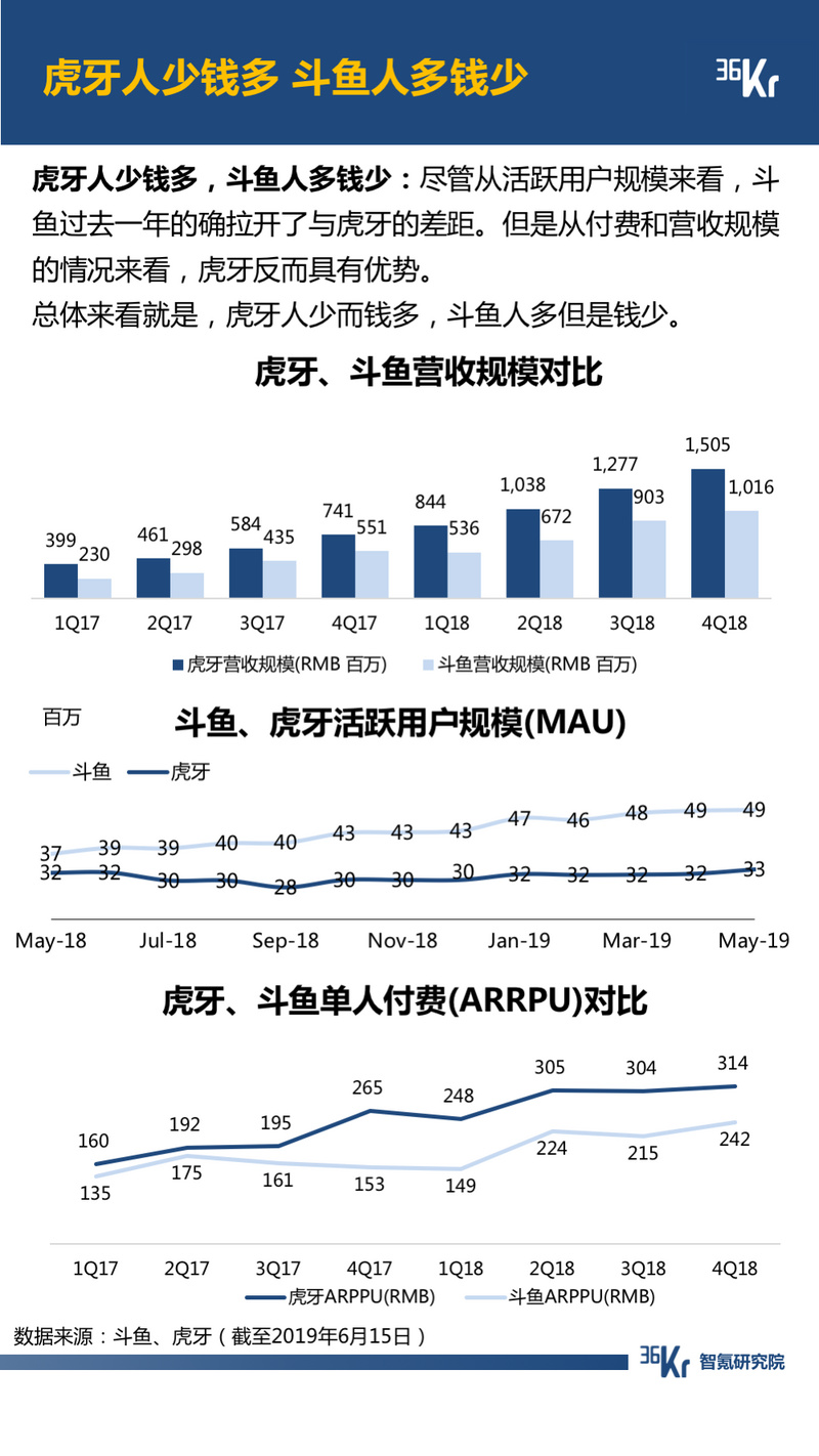 直播方面,就活跃用户规模来看,过去一年间,斗鱼逐步拉开了与虎牙的差距;然而,就付费情况来看,虎牙依然保持领先。总体来看,虎牙人少而钱多,斗鱼人多但是钱少。