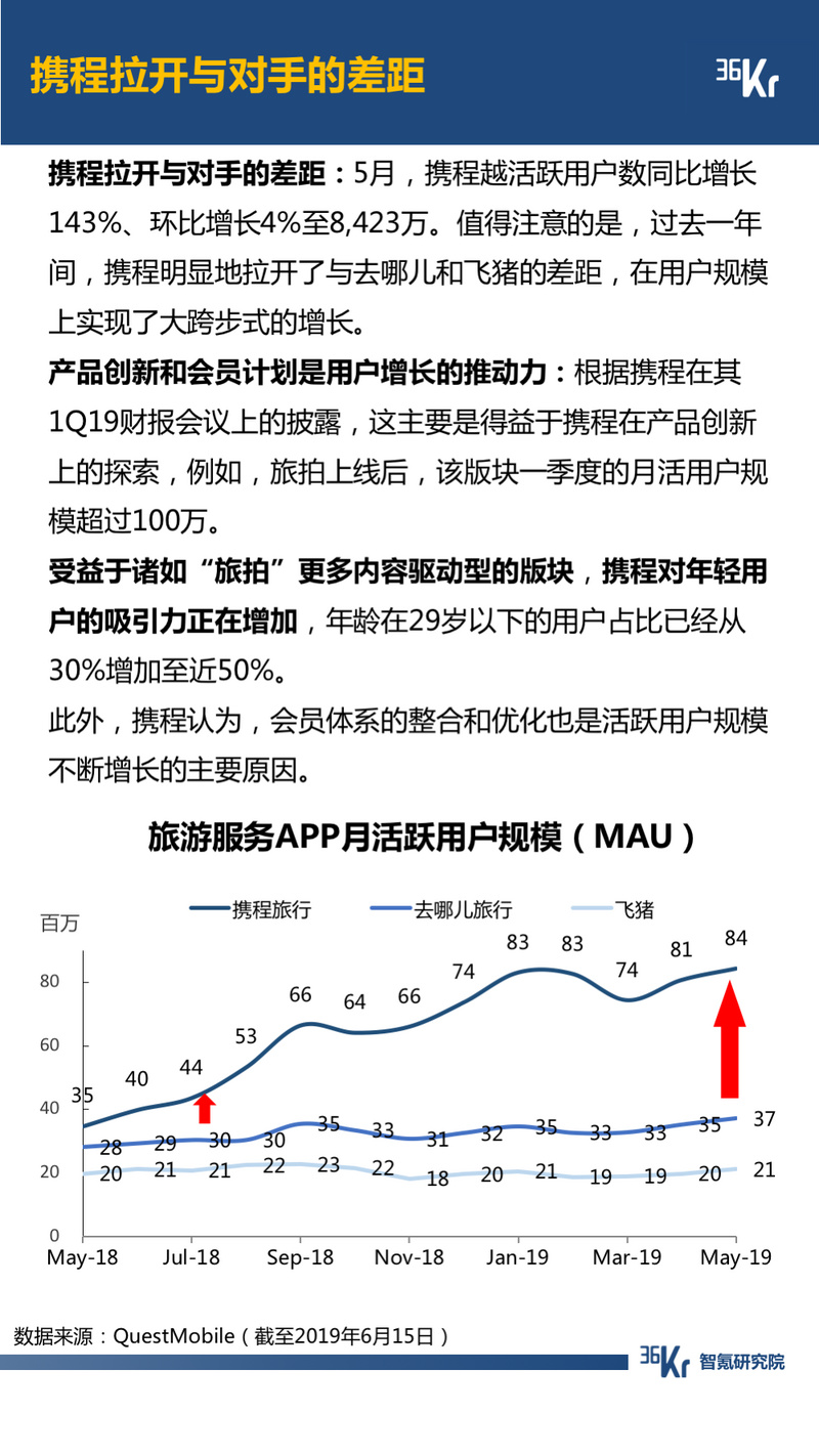 OTA行业中,过去一年间,携程的活跃用户规模实现了跨越式增长,拉开与对手的差距,这主要得益于产品创新和会员计划。受益于内容驱动型的版块,携程对年轻用户的吸引力正在增加。