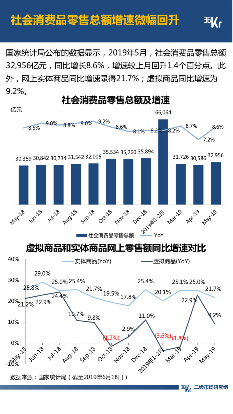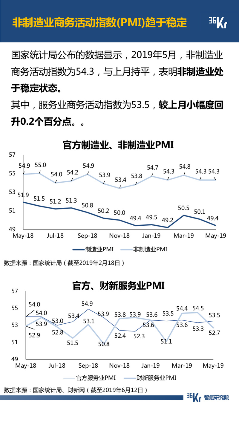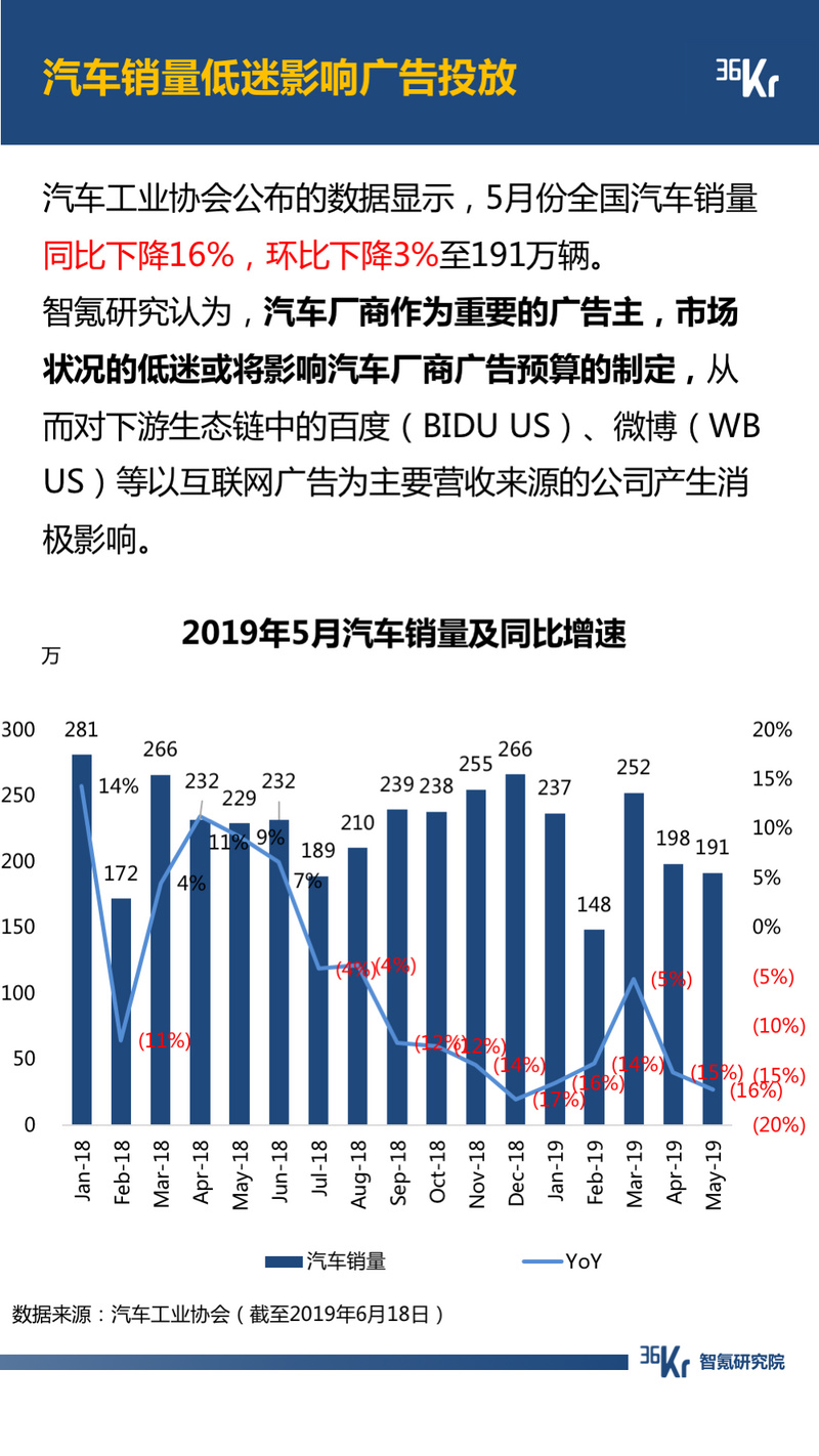 2019年5月,宏观经济环境基本维持稳定。但是,汽车销量同比、环比均出现下降。汽车厂商作为重要的广告主,市场状况的低迷或将影响汽车厂商广告预算的制定,从而对下游生态链中的百度(BIDU US)、微博(WB US)等以互联网广告为主要营收来源的公司产生消极影响。