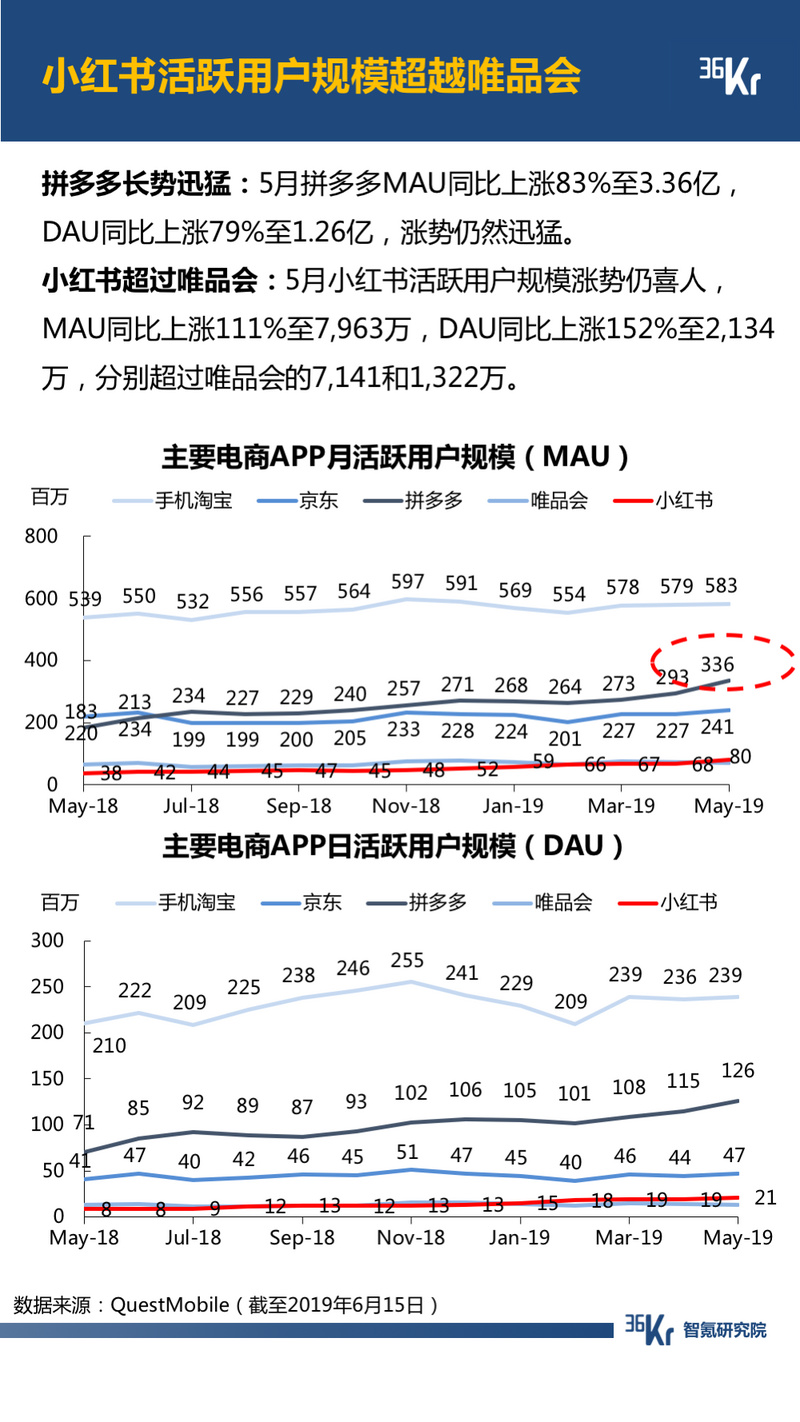 电商方面,拼多多活跃用户规模长势依然迅猛;小红书月活超越唯品会。