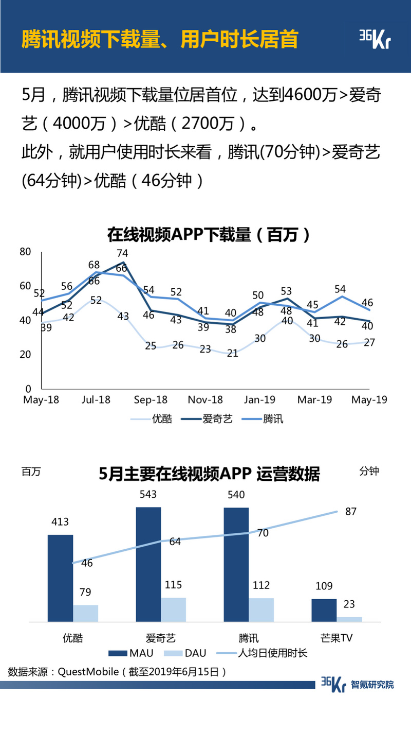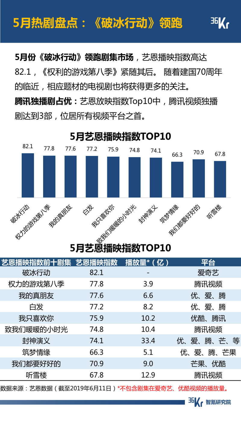 视频方面,头部平台的竞争早已经白热化。其中,腾讯视频攻势迅猛,下载量位居首位,且在艺恩放映指数Top10中,独播剧达到3部,位居所有视频平台之首。