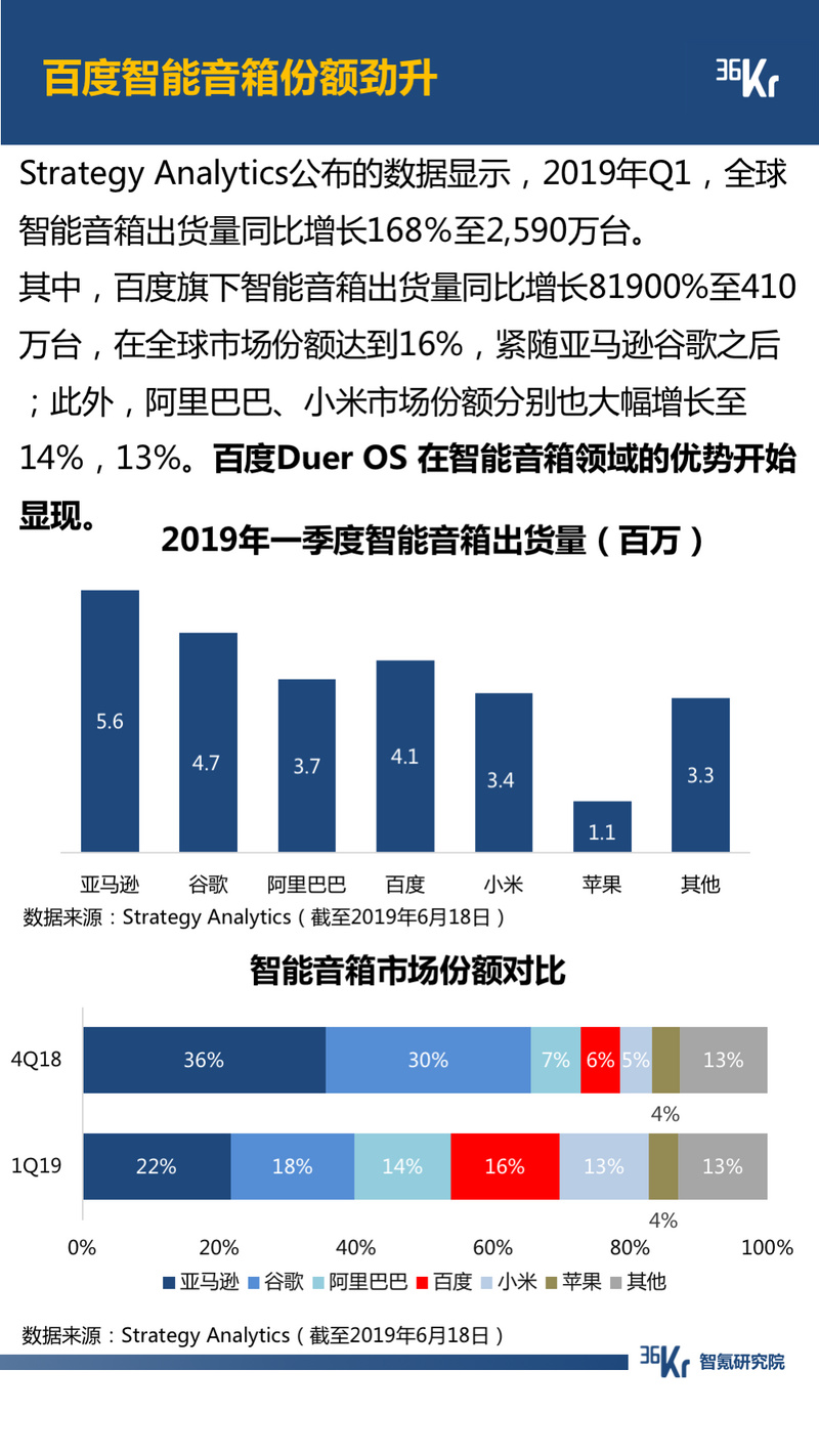 音乐方面,腾讯音乐持续称霸,百度智能音箱市场份额劲升,Duer OS 在智能音箱领域的优势开始显现。