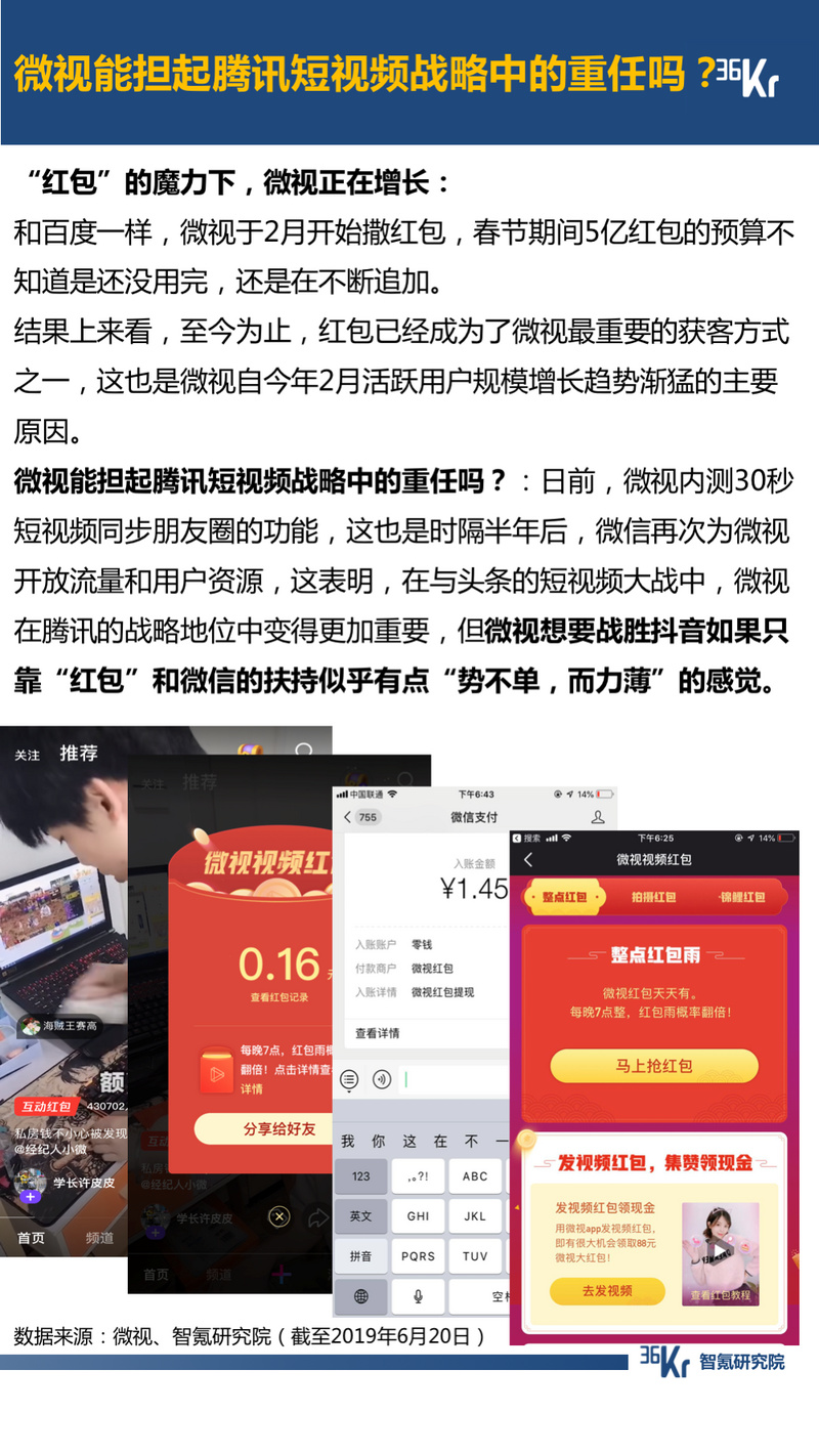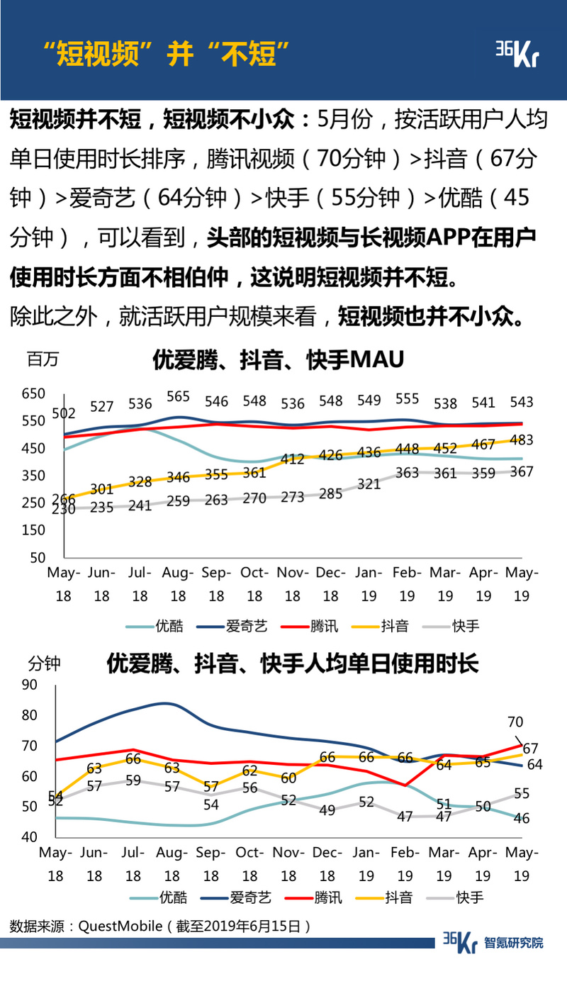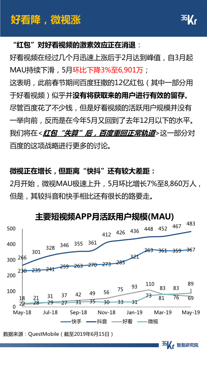 短视频领域,3月开始快手和抖音的用户规模重新拉大;“红包”对好看视频的激素效应已经消退,微视则在“红包”的魔力下实现增长。微视和抖音的对战中,微视“势不单,而力薄”。智氪研究认为,就用户使用时长来看,“短视频”并“不短”;就用户规模来看,短视频并不小众。