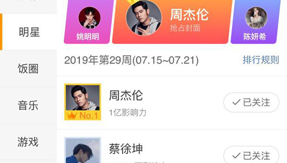 在2019年的第29周,周杰伦在“微博明星超话榜”上排名超越流量偶像蔡徐坤,以1亿影响力跃居榜首。