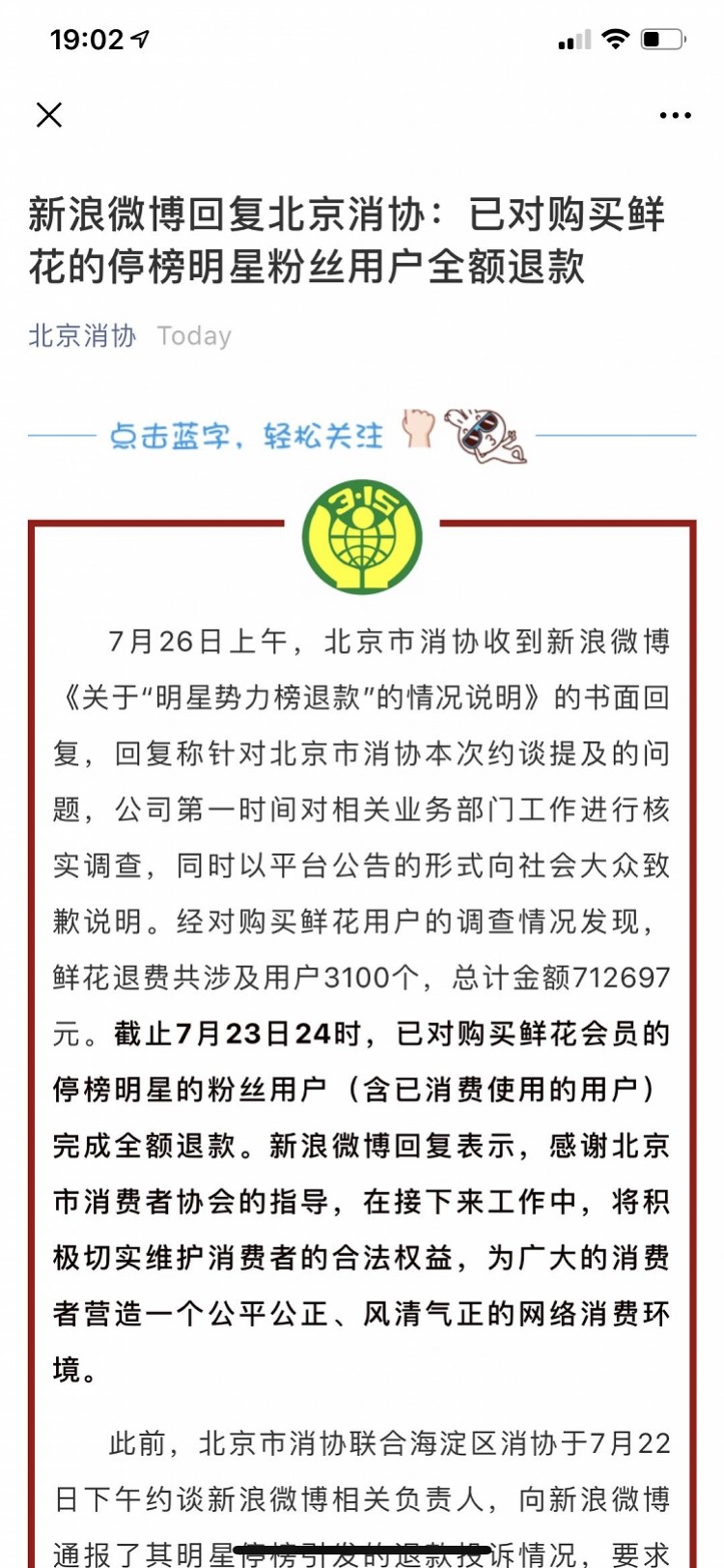 7月29日,北京消费者协会在其公众号发布声明称,于26日收到新浪微博《关于“明星势力榜退款”的情况说明》的书面回复。说明中提到,截止到7月23日24时,新浪微博已对购买鲜花会员的停榜明星的粉丝用户(含已消费使用的用户)完成全额退款,鲜花退费共涉及用户3100个,总计金额712697元。