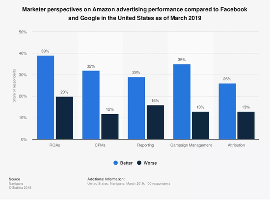同时,亚马逊的转化率也非常好,大约在20%-30%,而Facebook的转化率仅为1%-10%。因为消费者来到亚马逊就是为了买东西,是带着意愿来的,而Facebook的广告“更具有侵略性,信任度也更低”。