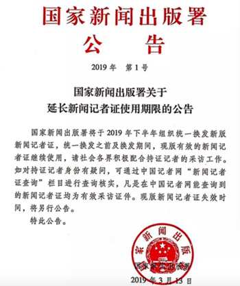 (国家新闻出版署2019年3月13日发布的《国家新闻出版署关于延长新闻记者证使用期限的公告》)