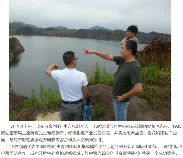 该网站2014年8月2日刊文,8月1日上午,《变形金刚4》中方总制片人、电影频道节目中心网站总编辑梁龙飞先生、1905网站董事局主席薛克先生专程到海宁考察影视产业发展情况,并实地考察盐官、袁花和译制产业园,与海宁影管委就双方电影内容合作深入交流与探讨。电影频道作为中国电影的主要制作商和集成播控平台,近年来开始走国际化路线,与好莱坞派拉蒙团队合作,成功开辟中外合拍片新领域,其中票房20亿的《变形金刚4》就是一个成功案例。