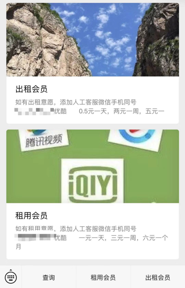 另外,还多个专门提供“租用会员”和“出租会员”服务的微信公众号,可以低价买到包括多个视频网站在内的会员账号。“如果你有闲置的会员账号可以提供给我们,我们可以帮你出租出去。需要低价使用某些会员也可以联系我们。”以一个名为“君*”的微信公众号为例,该公众号提供多个视频网站以及喜马拉雅、网易云音乐、UC小说等会员账号。根据公众号中展示的价格表,优酷会员价格为0.5元一天,2元一周,5元一个月;腾讯和爱奇艺的会员为0.5元一个月,2元五天,7元一个月。租用会员的价格则“稍高”,优酷会员为一元一天,三元一周,六元一个月。