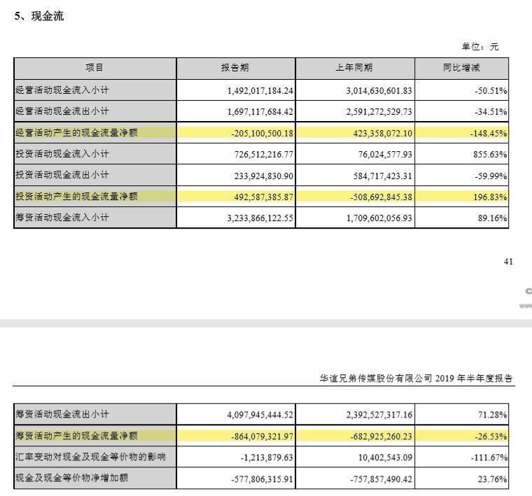 每经记者注意到,报告期内,华谊兄弟经营活动产生的现金流量净额为-2.05亿元,相比去年同期的4.23亿元,下降148.45%,公司表示,主要是因为支付影片分账款及影片投资款所致。相比之下,公司投资活动产生的现金流量净额为4.93亿元,较上年同期相比上升196.83%,主要是因为报告期内公司收到部分参股公司股权出售款项,及子公司收到理财收益所致。