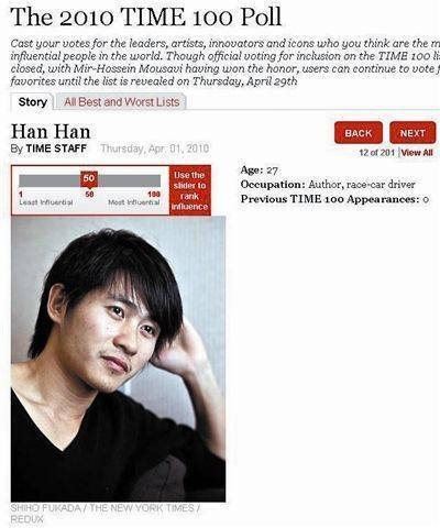 2009年11月,美国《时代周刊》公布了2019年度“100位全球最具影响力人物”的评选结果,韩寒以中国青年作家的身份入选候选人名单,并且以100万的票数排在第二位,超过了刚刚在前一年当选总统奥巴马,和2008年的新晋世界首富“股神”巴菲特。