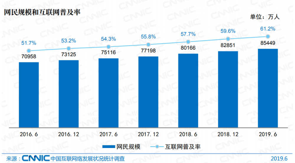 截至2019年6月,我国网民规模达8.54亿,较2018年底增长2598万,互联网普及率达61.2%,较2018年底提升1.6个百分点。